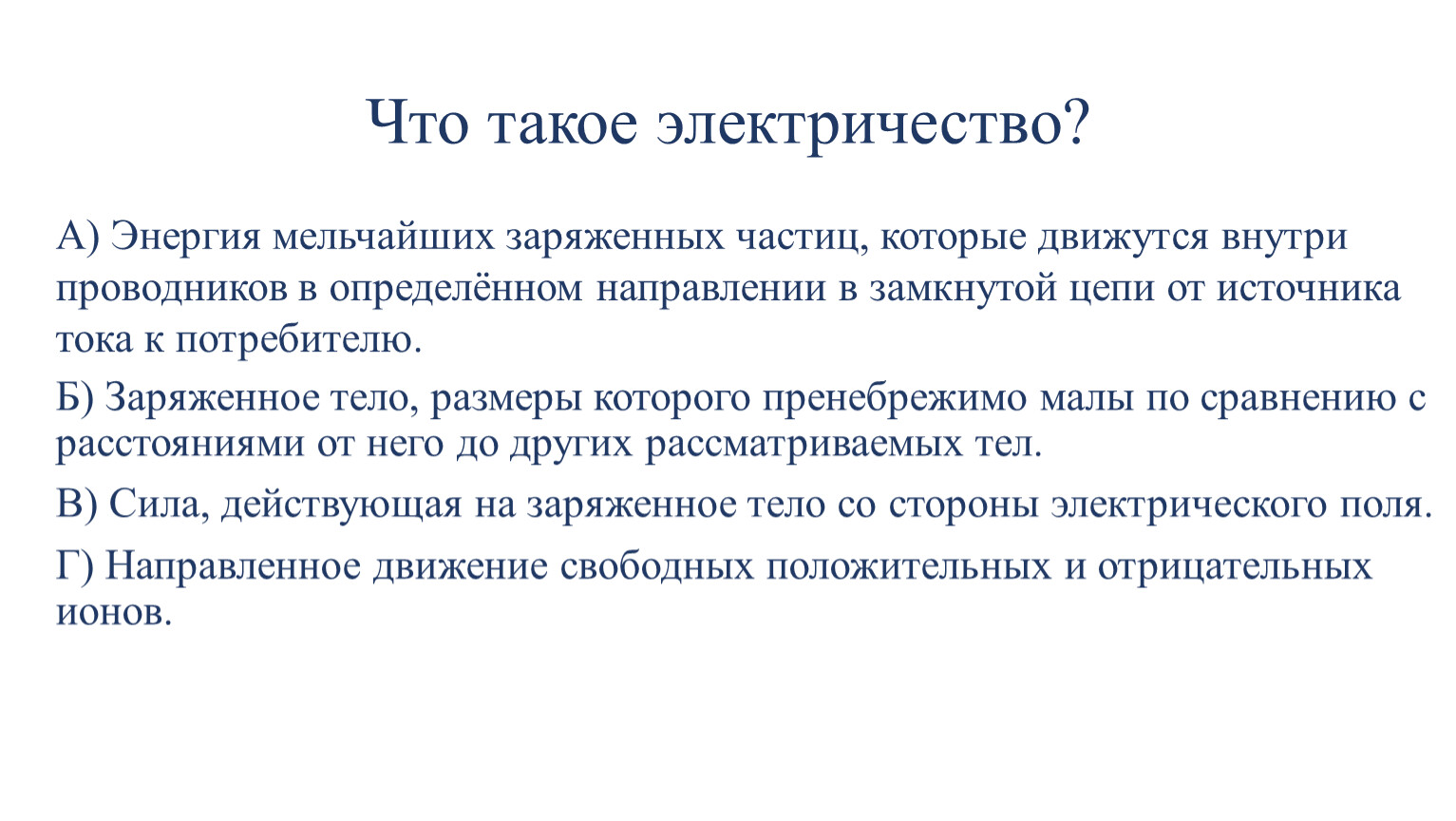 А) Энергия мельчайших заряженных частиц, которые движутся внутри проводников в определённом направлении в замкнутой цепи от источника тока к потребителю.
