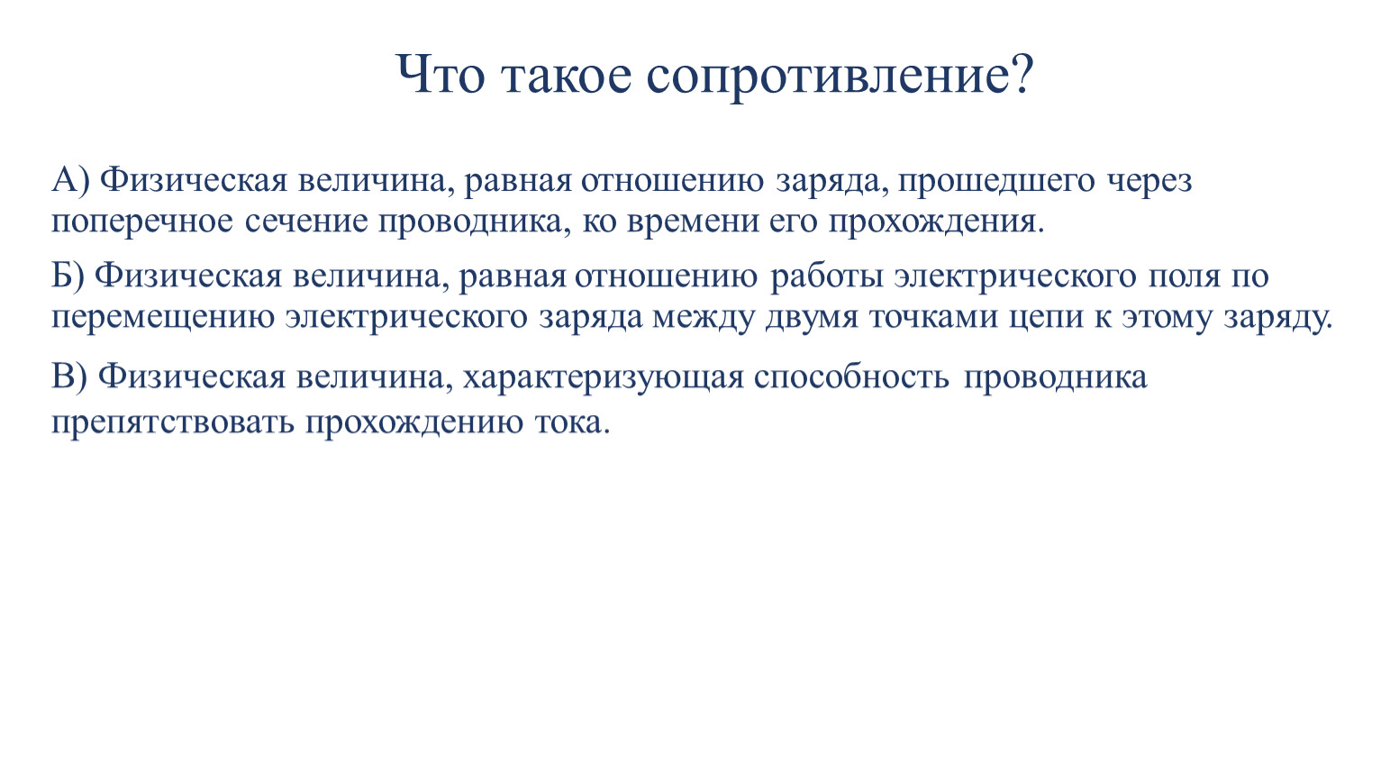 А) Физическая величина, равная отношению напряжения на концах проводника к силе тока, проходящего по нему.