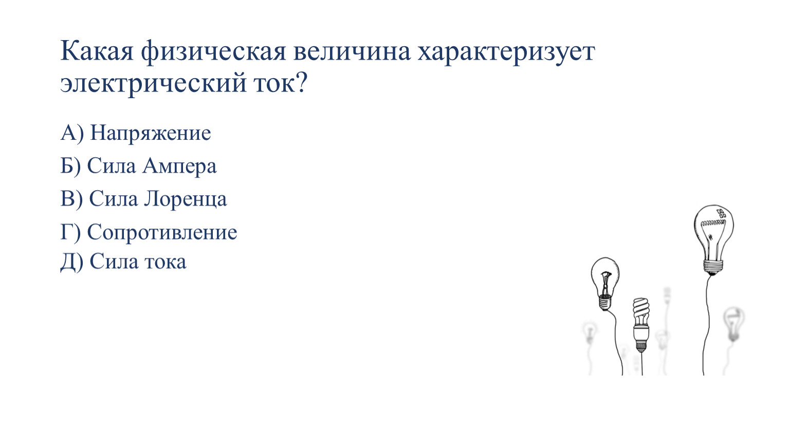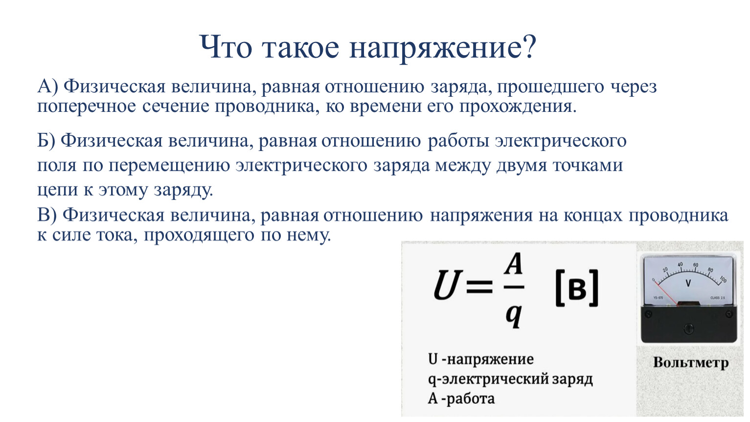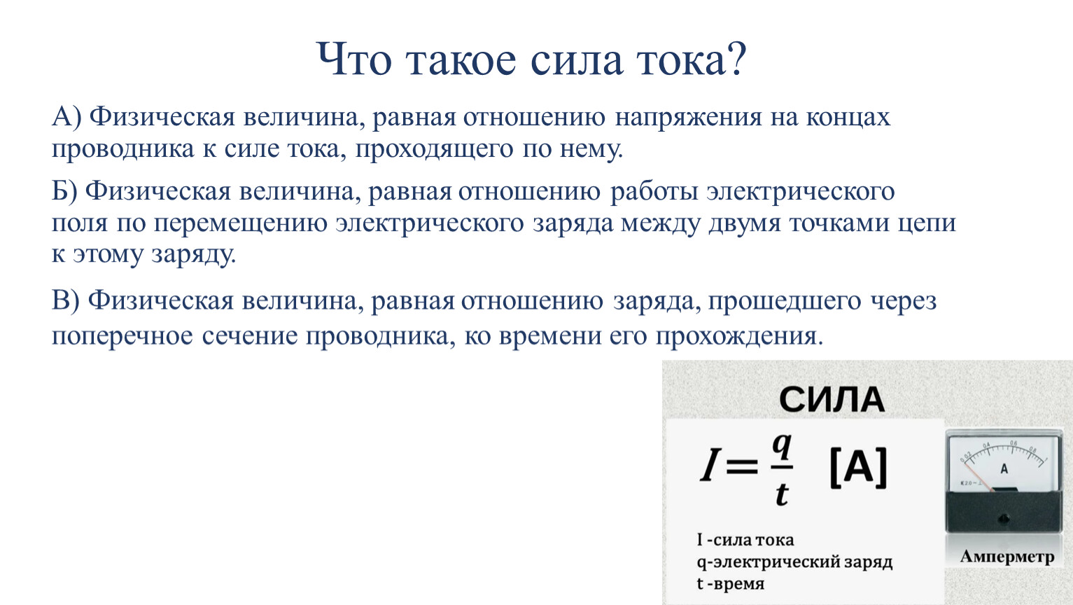 А) Физическая величина, равная отношению заряда, прошедшего через поперечное сечение проводника, ко времени его прохождения.
