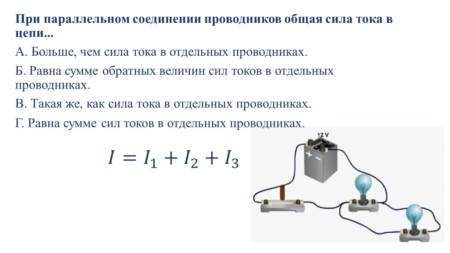 Б. Равна сумме обратных величин сил токов в отдельных проводниках.