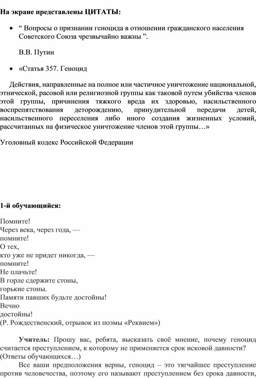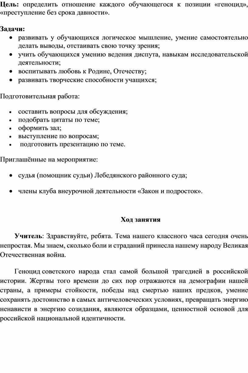 Учитель: Прошу вас, ребята, высказать своё мнение, почему геноцид считается преступлением, к которому не применяется срок исковой давности?