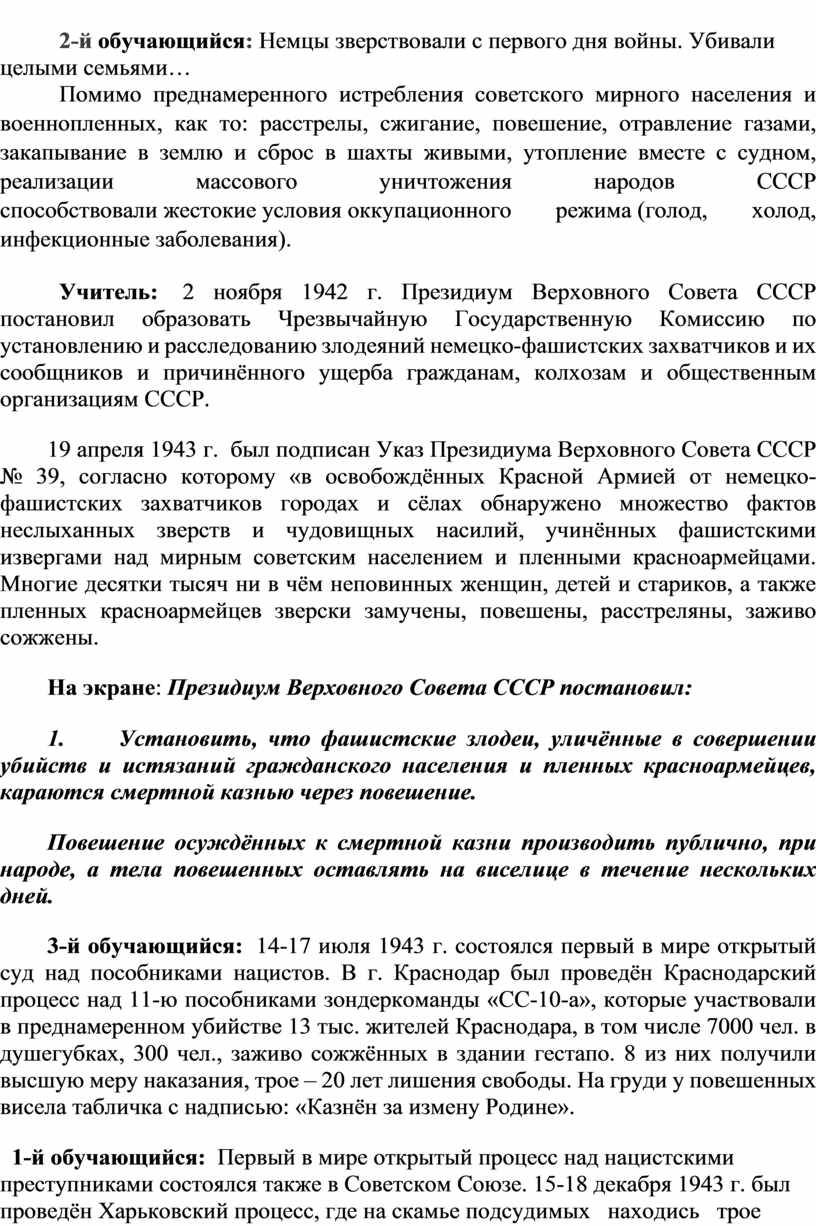 Учитель: 2 ноября 1942 г. Президиум Верховного Совета СССР постановил образовать Чрезвычайную Государственную Комиссию по установлению и расследованию злодеяний немецко-фашистских захватчиков и их сообщников и причинённого ущерба гражданам, колхозам и общественным организациям СССР.