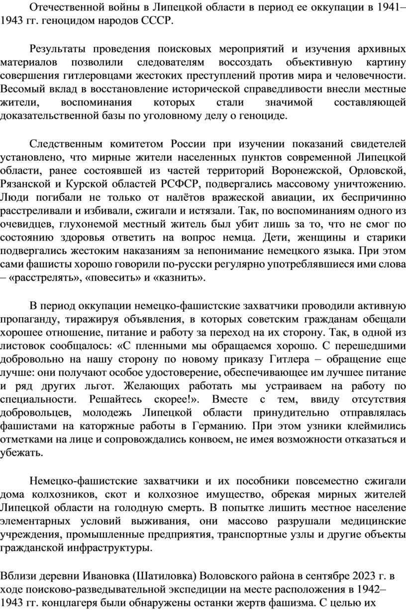Так, 25 июля 2024 г. Липецкий областной суд признал преступления немецко-фашистских захватчиков и их пособников в годы Великой Отечественной войны в Липецкой области в период ее оккупации в 1941–1943 гг. геноцидом народов СССР.