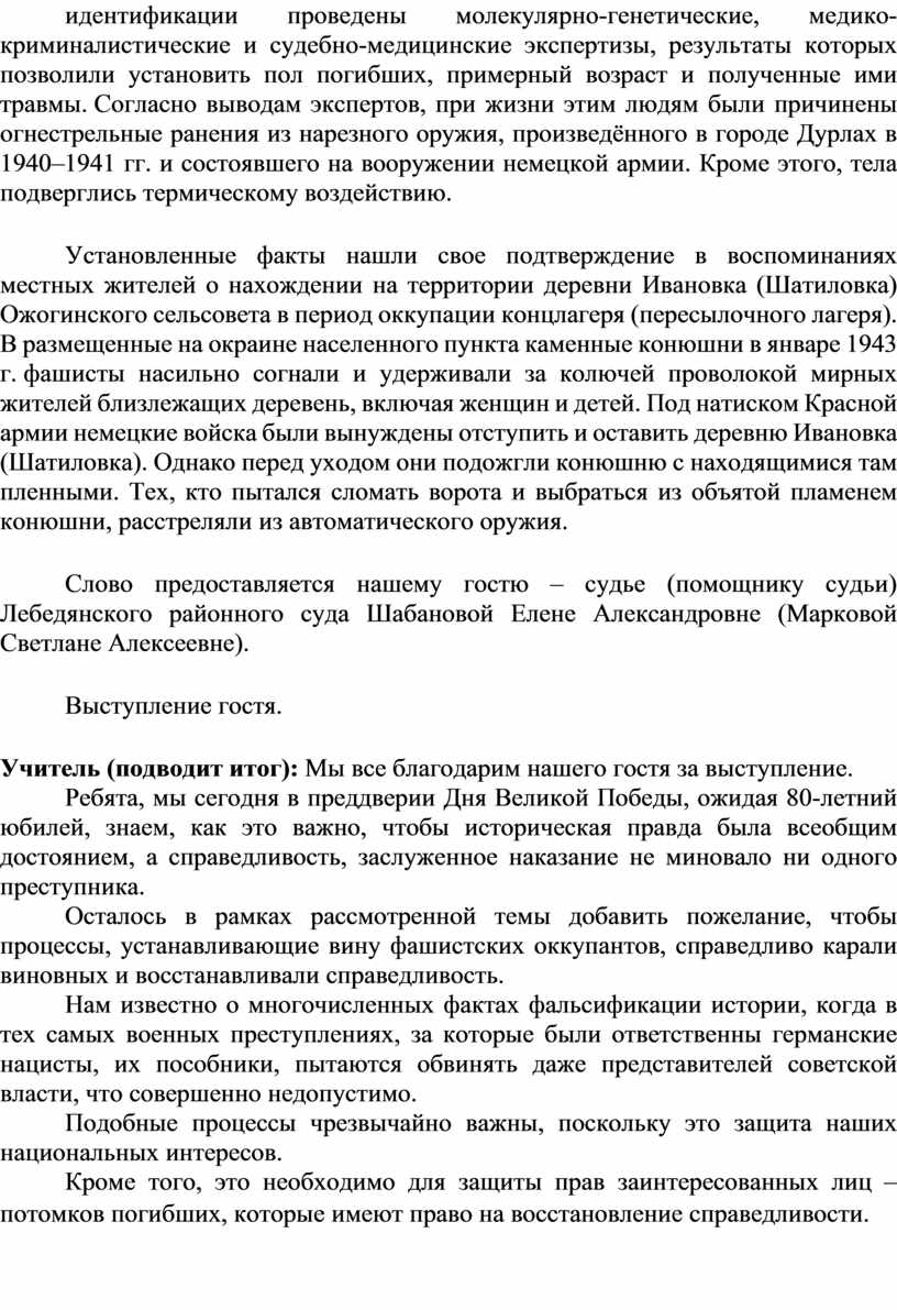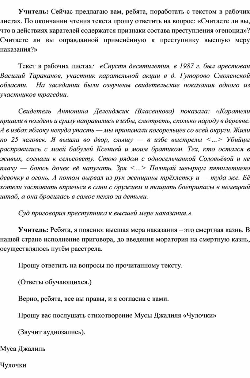 Учитель: Сейчас предлагаю вам, ребята, поработать с текстом в рабочих листах. По окончании чтения текста прошу ответить на вопрос: «Считаете ли вы, что в действиях карателей содержатся признаки состава преступления «геноцид»? Считаете ли вы оправданной применённую к преступнику высшую меру наказания?»