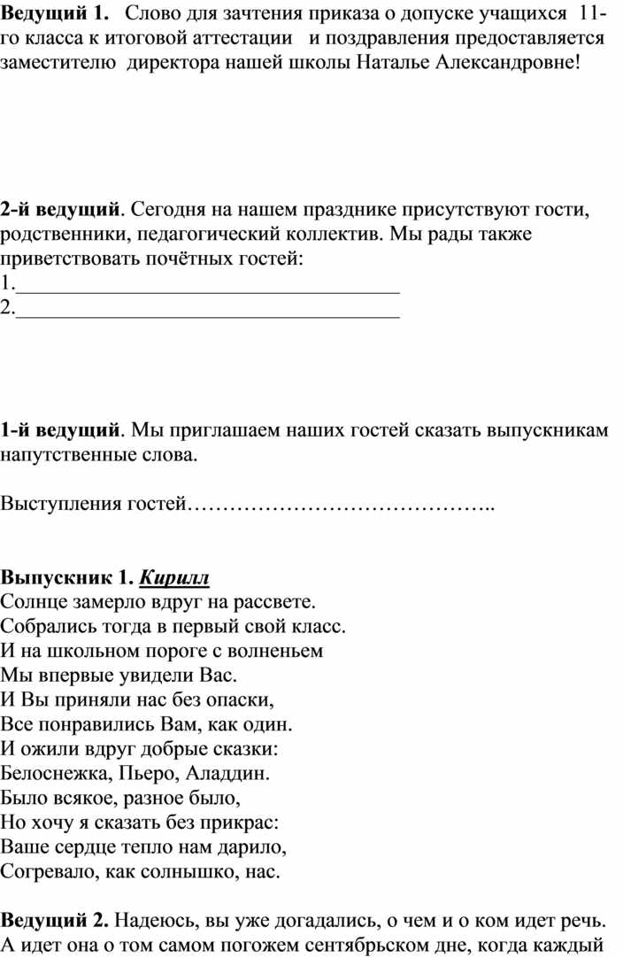 Ведущий 1. Слово для зачтения приказа о допуске учащихся 11-го класса к итоговой аттестации и поздравления предоставляется заместителю директора нашей школы Наталье Александровне!