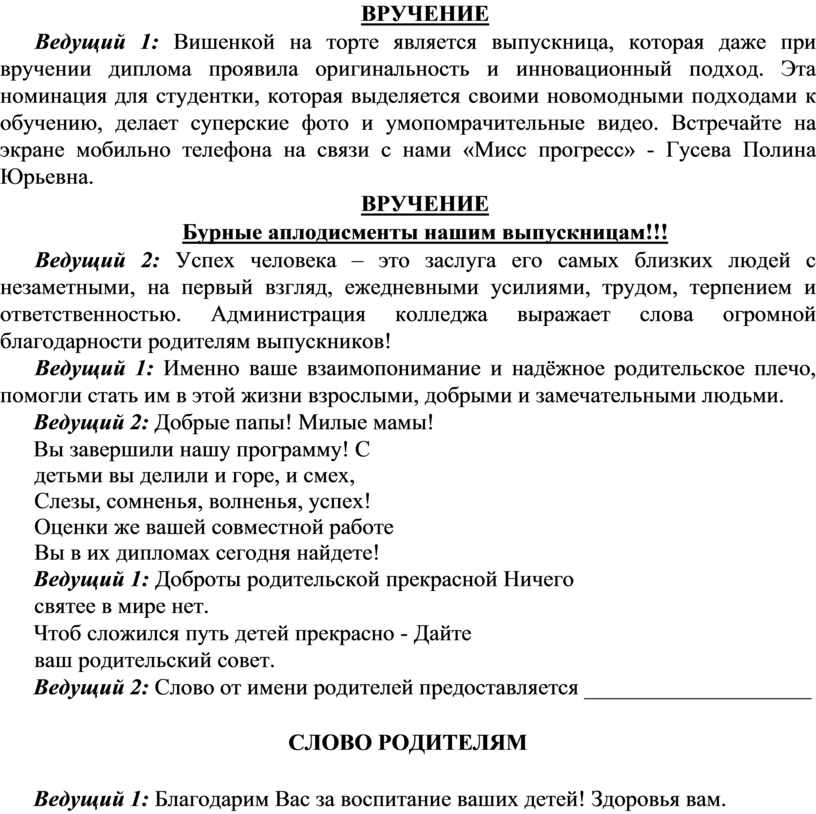 Ведущий 2: Слово от имени родителей предоставляется ____________________