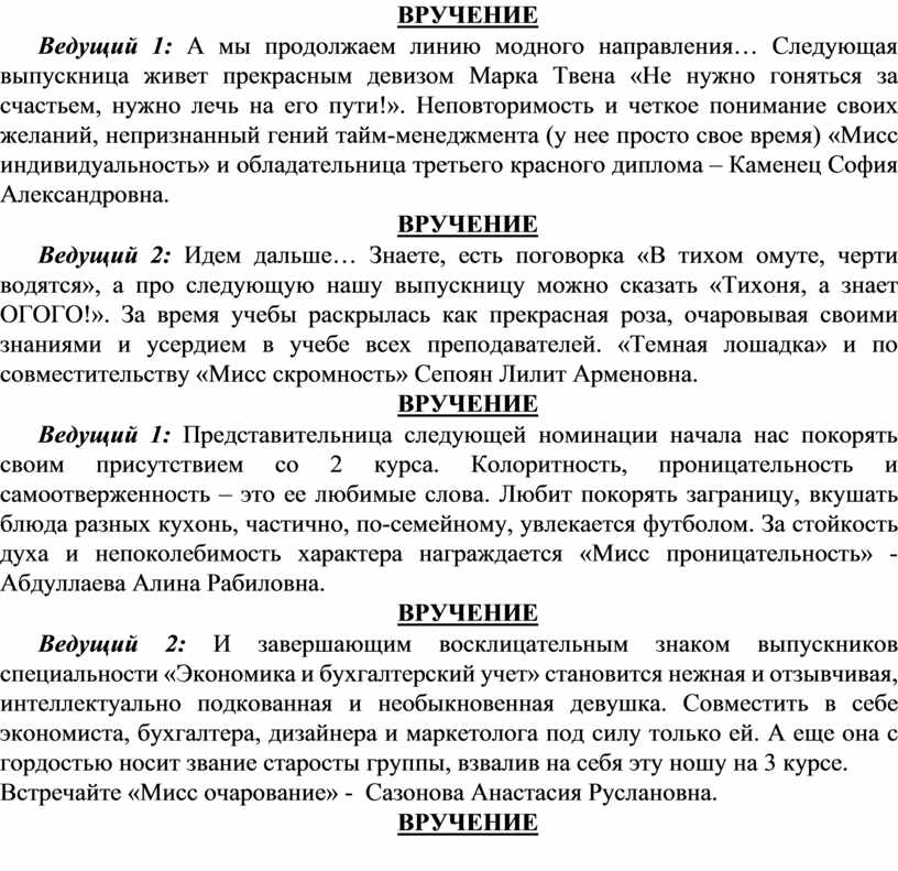 Ведущий 2: Давайте поприветствуем и наградим бурными аплодисментами наших выпускников. Это студенты по 2 специальностям: «Экономика и бухгалтерский учет» и «Специальное дошкольное образование».