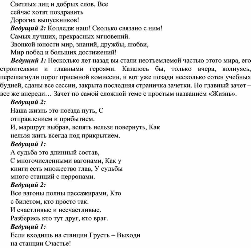 Ведущий 1: Несколько лет назад вы стали неотъемлемой частью этого мира, его строителями и главными героями. Казалось бы, только вчера, волнуясь, перешагнули порог приемной комиссии, и вот уже позади несколько сотен учебных будней, сданы все сессии, закрыта последняя страничка зачетки. Но главный зачет – все же впереди… Зачет по самой сложной теме с простым названием «Жизнь».
