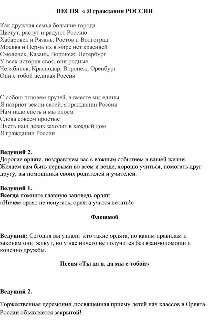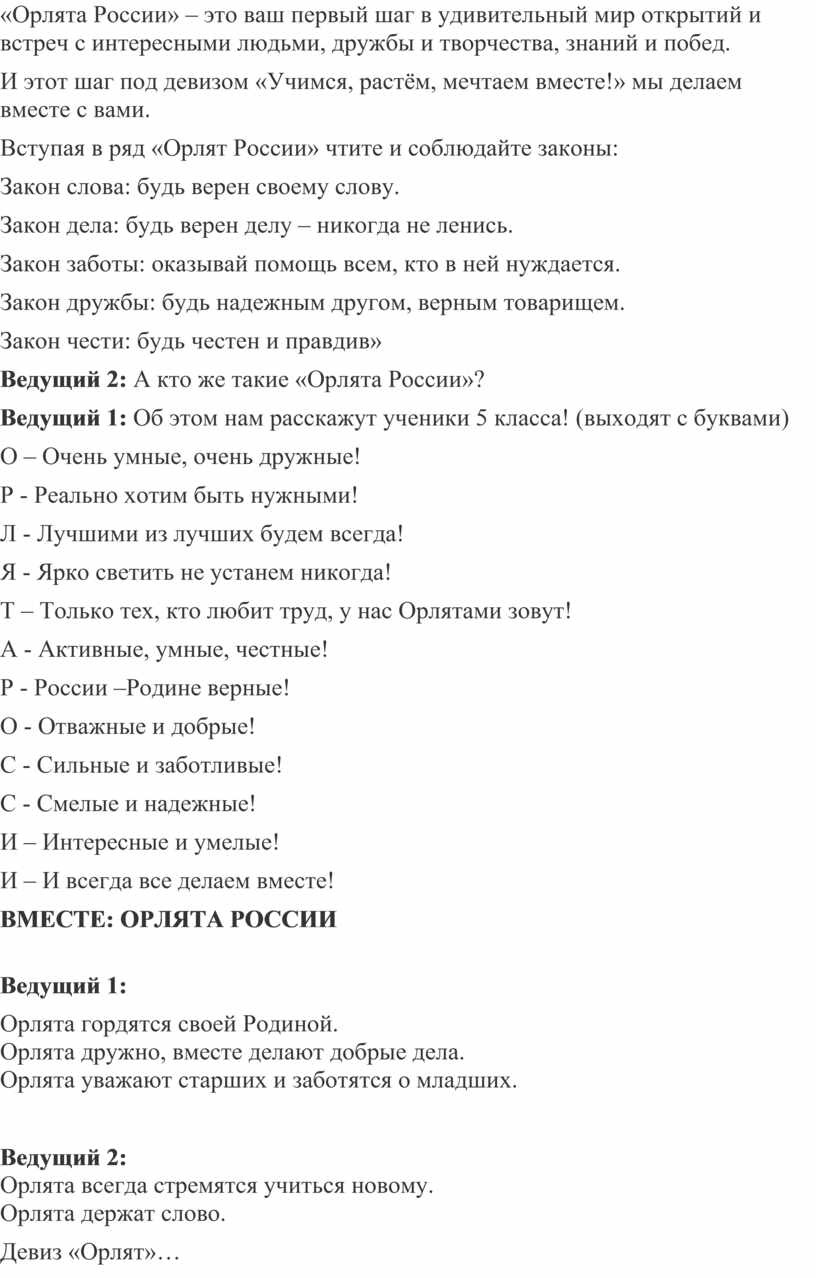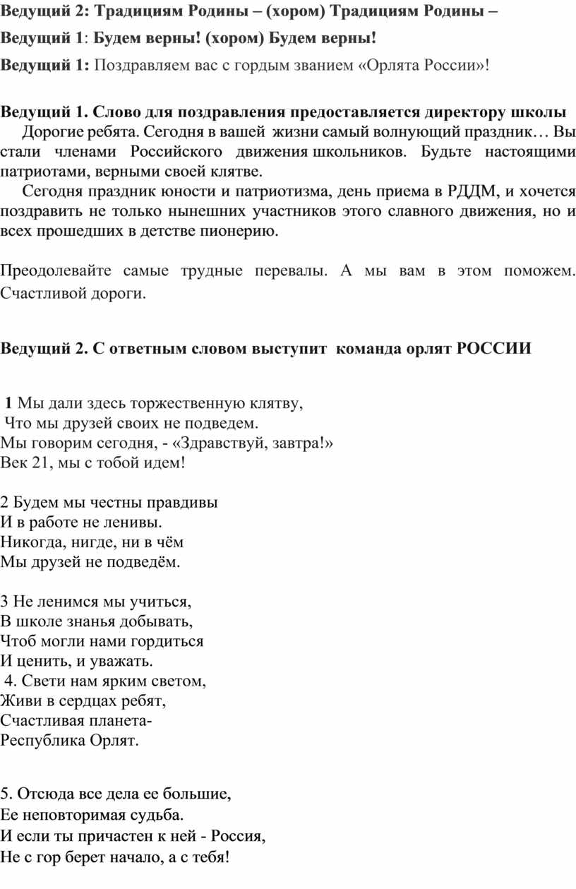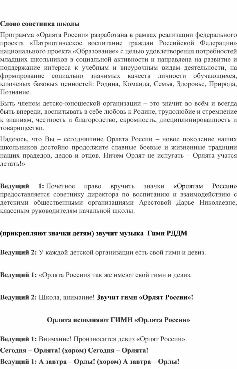 Ведущий 1: Сегодня у Вас праздник, вы вступаете в ряды Российского движения детей и молодежи, под названием « ОрлятА России.»
