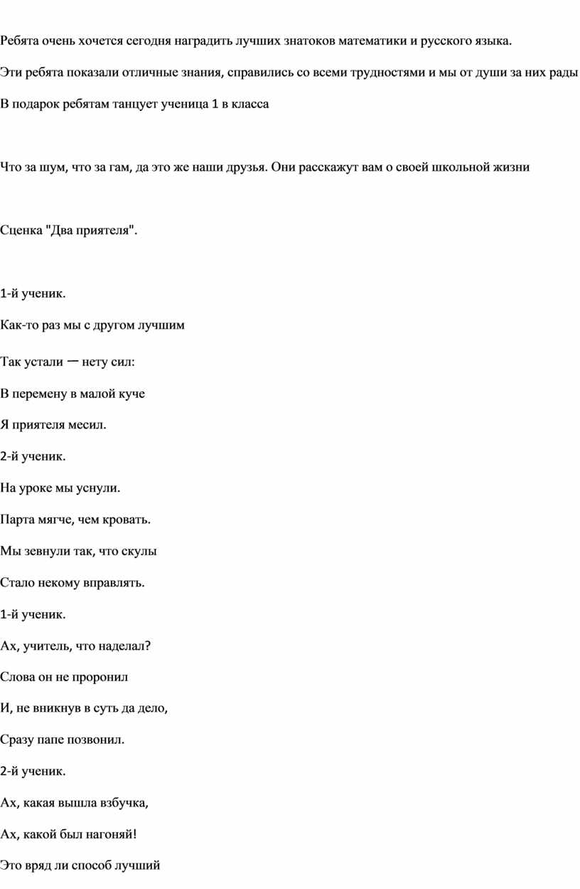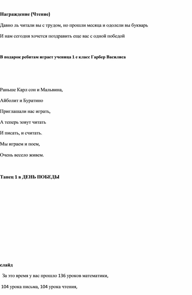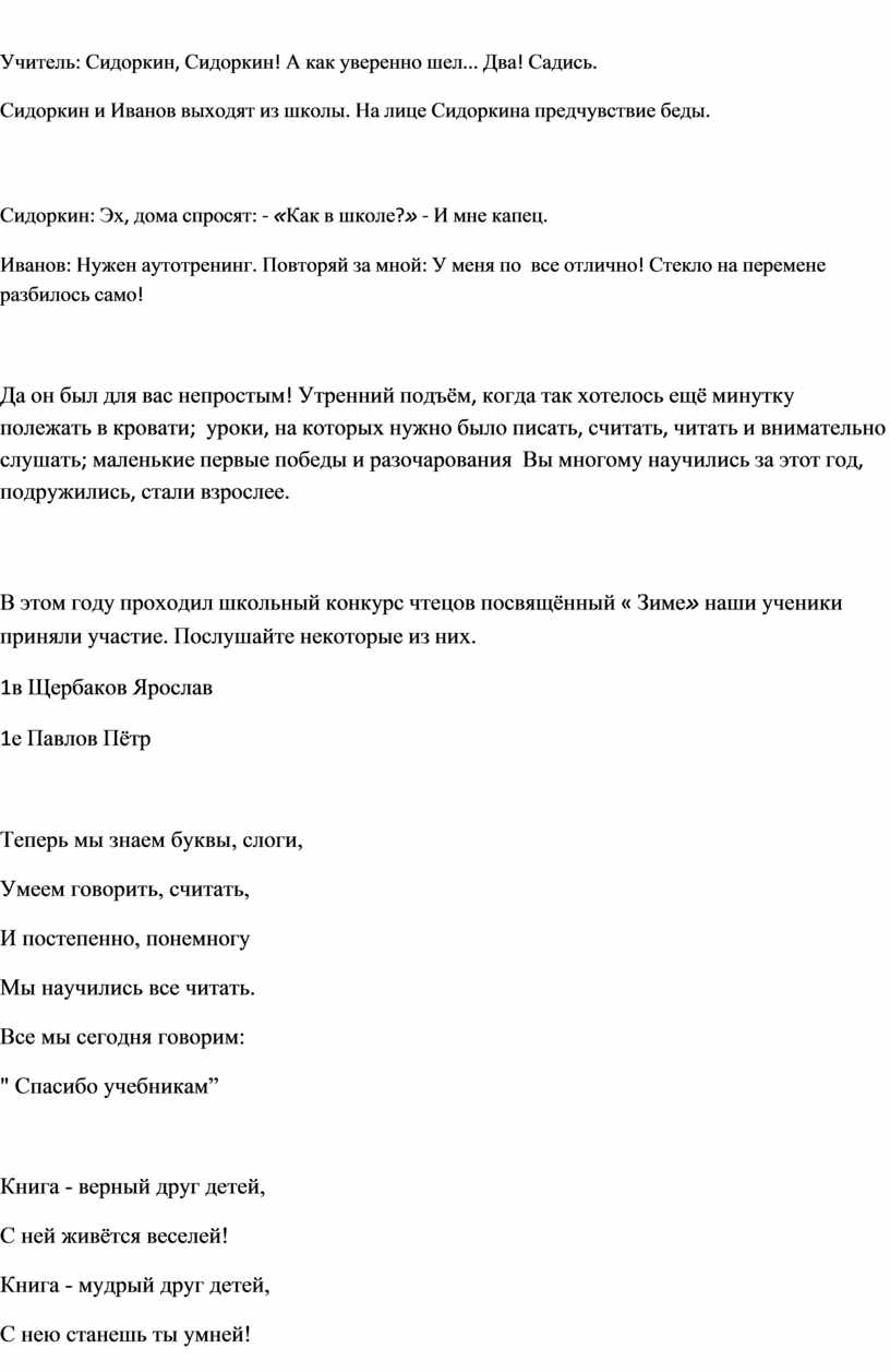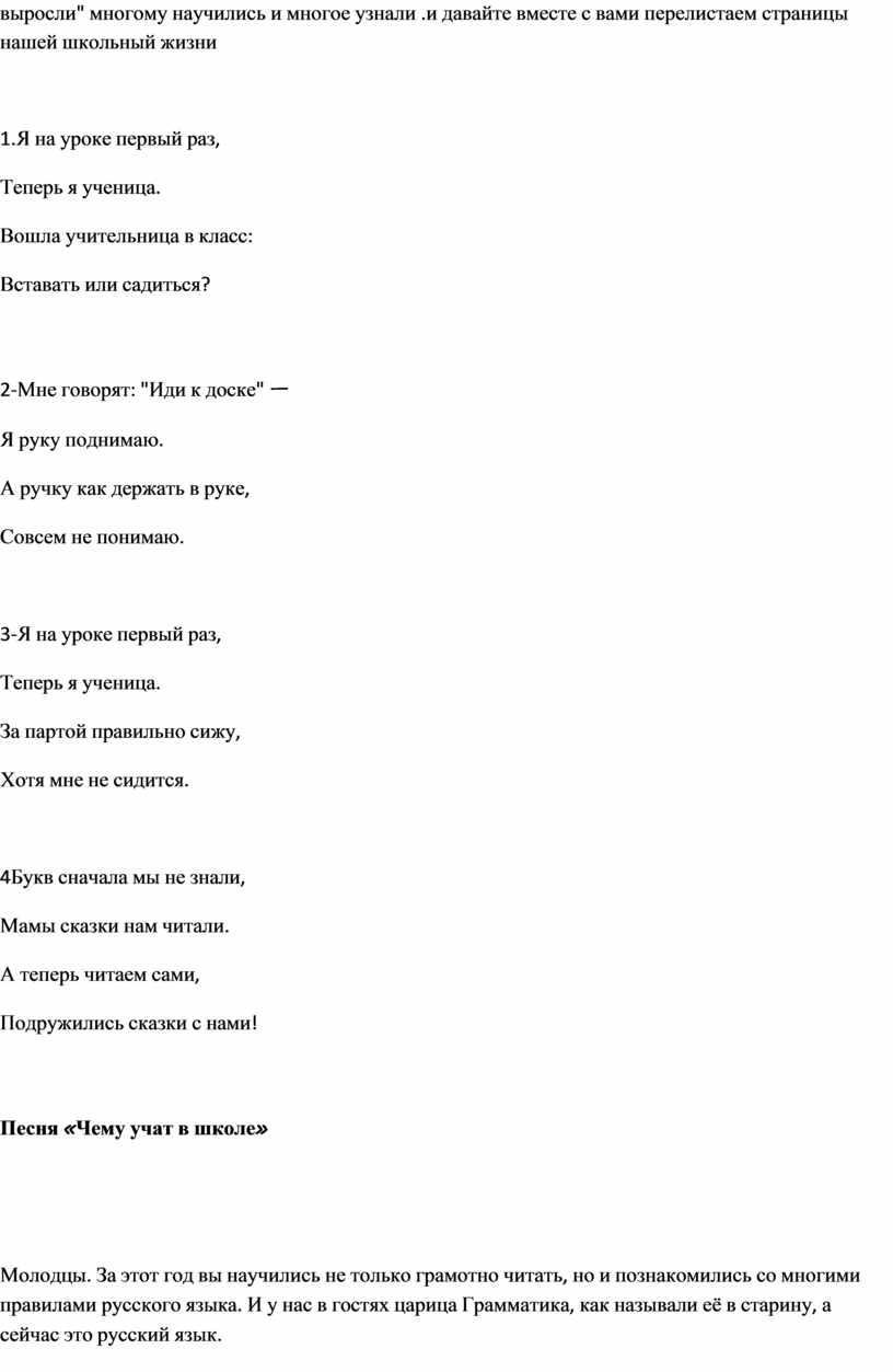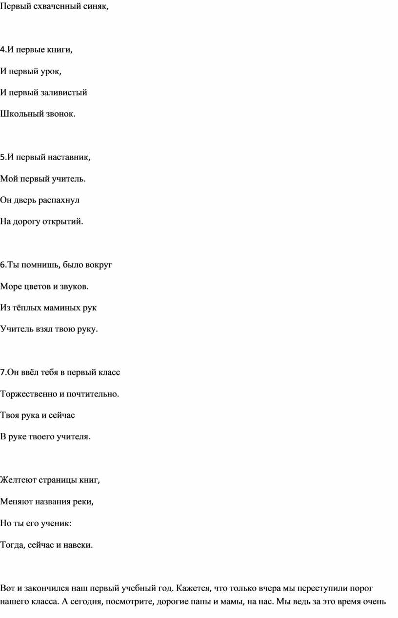 Вот и закончился наш первый учебный год. Кажется, что только вчера мы переступили порог нашего класса. А сегодня, посмотрите, дорогие папы и мамы, на нас. Мы ведь за это время очень выросли" многому научились и многое узнали .и давайте вместе с вами перелистаем страницы нашей школьный жизни