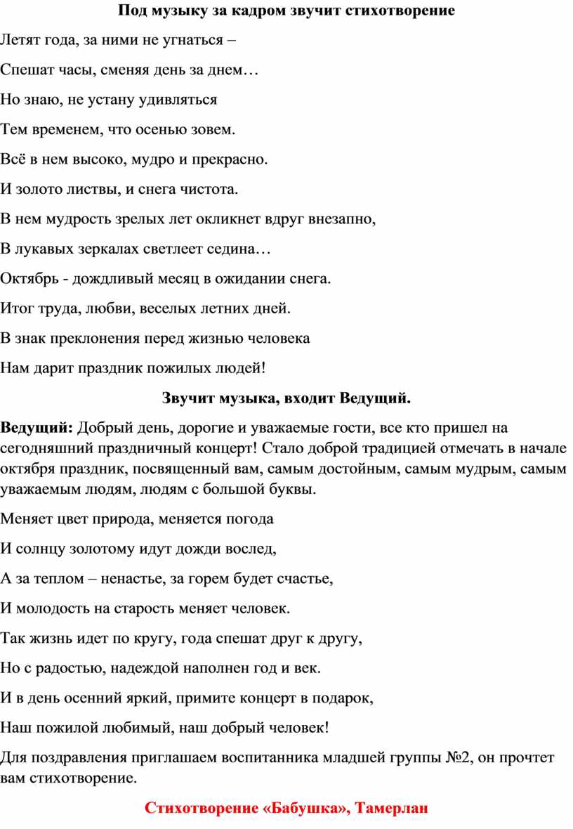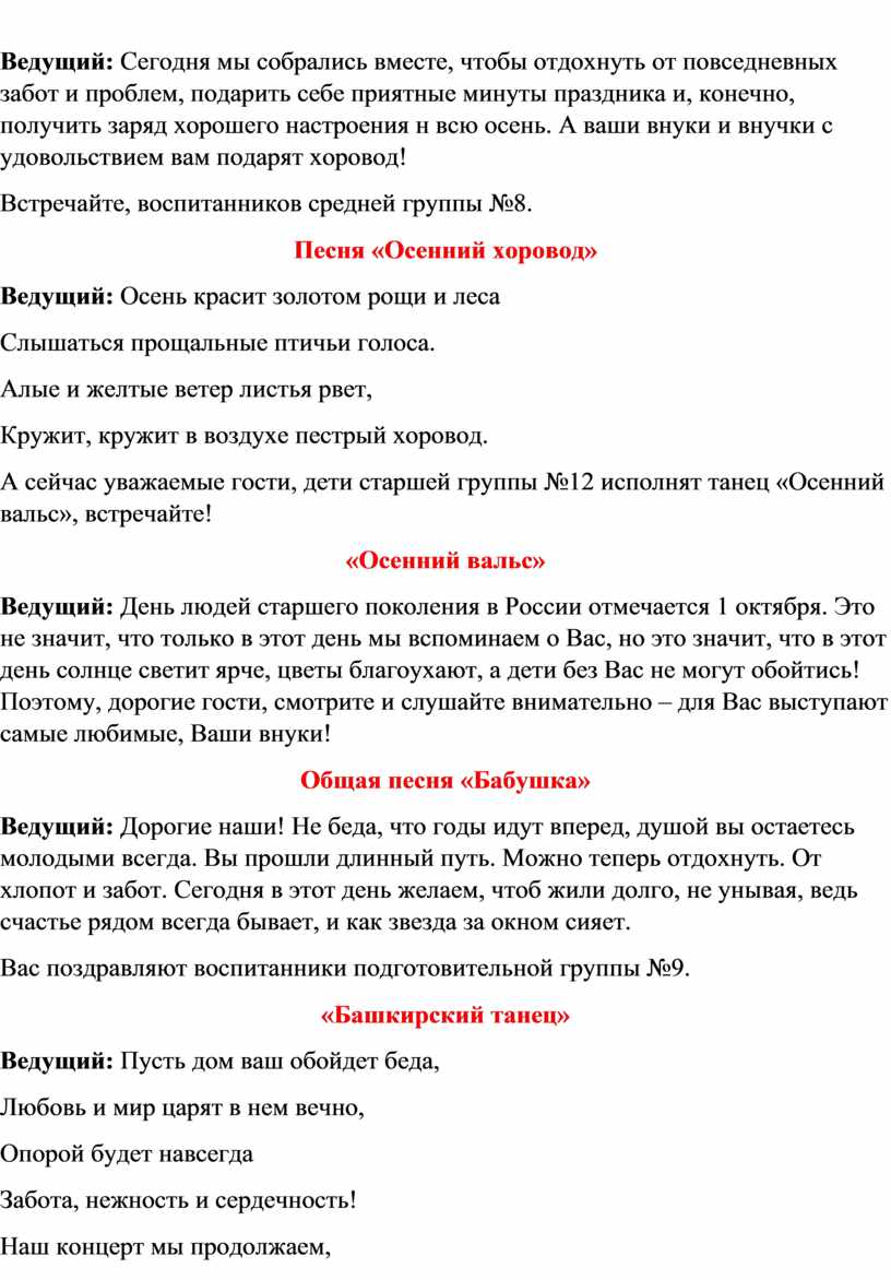 Ведущий: День людей старшего поколения в России отмечается 1 октября. Это не значит, что только в этот день мы вспоминаем о Вас, но это значит, что в этот день солнце светит ярче, цветы благоухают, а дети без Вас не могут обойтись! Поэтому, дорогие гости, смотрите и слушайте внимательно – для Вас выступают самые любимые, Ваши внуки!