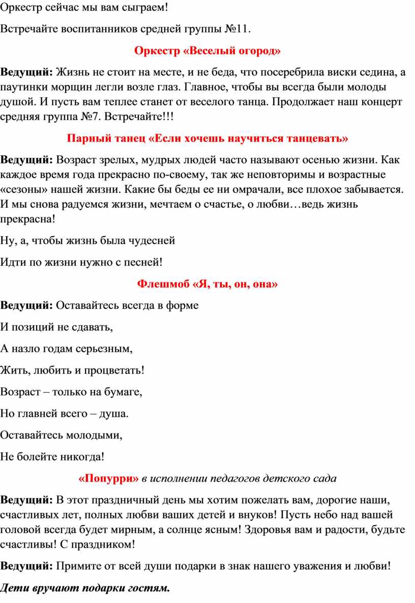 Ведущий: Добрый день, дорогие и уважаемые гости, все кто пришел на сегодняшний праздничный концерт! Стало доброй традицией отмечать в начале октября праздник, посвященный вам, самым достойным, самым мудрым, самым уважаемым людям, людям с большой буквы.