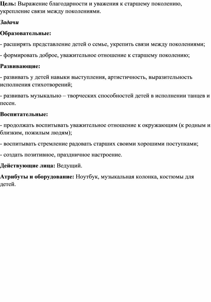 Цель: Выражение благодарности и уважения к старшему поколению, укрепление связи между поколениями.