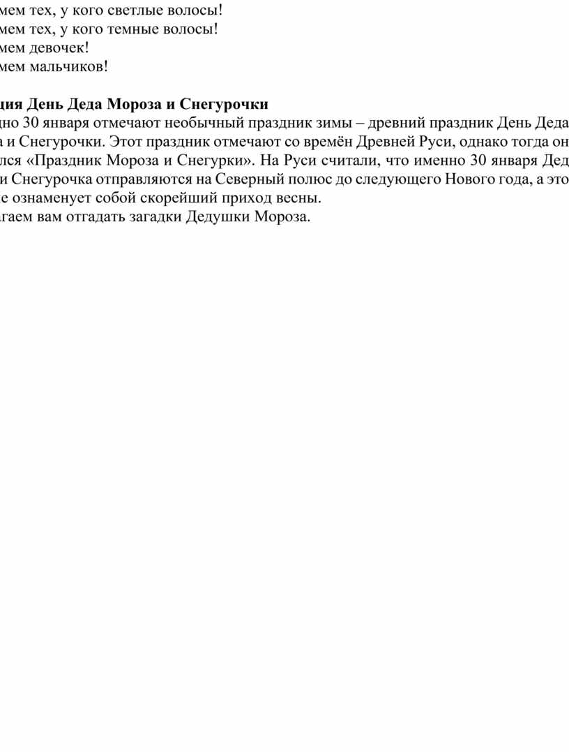 Ежегодно 30 января отмечают необычный праздник зимы – древний праздник День Деда Мороза и Снегурочки. Этот праздник отмечают со времён Древней Руси, однако тогда он назывался «Праздник Мороза и Снегурки». На Руси считали, что именно 30 января Дед Мороз и Снегурочка отправляются на Северный полюс до следующего Нового года, а это событие ознаменует собой скорейший приход весны.