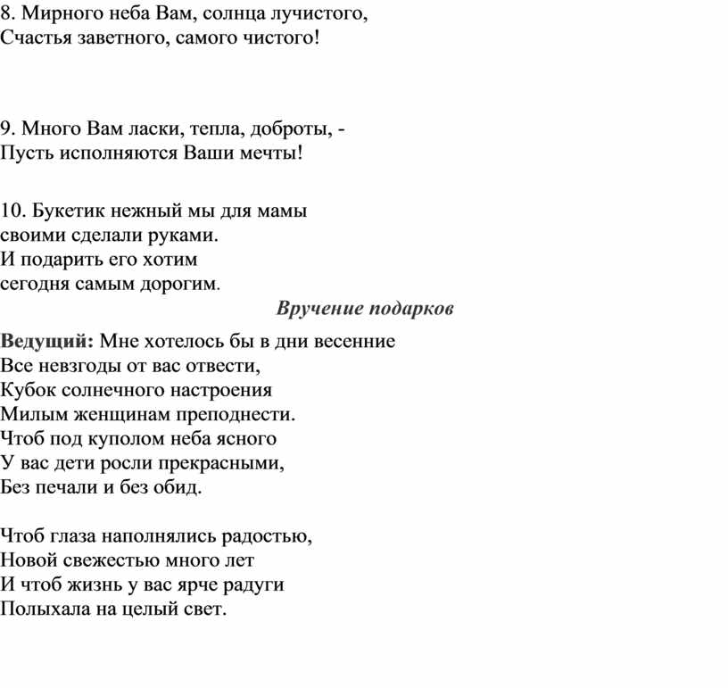 - Милые наши женщины, разрешите от всей души поздравить Вас с этим праздником и пожелать Вам в этот торжественный день крепкого здоровья, семейного благополучия и согласия, стойкости и терпения, мира и долголетия, а также всегда хорошего настроения!