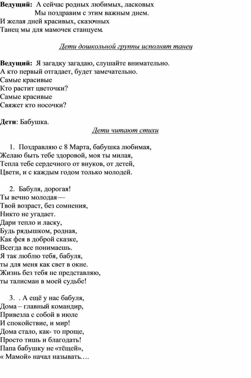 Ведущий. Все с нетерпением ждут 8 Марта, но не потому, что ждут дорогих подарков, а потому, что это – день сюрпризов. Концертную сюрпризную программу подготовили наши дети.