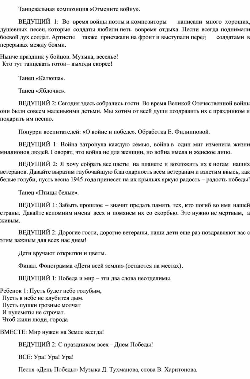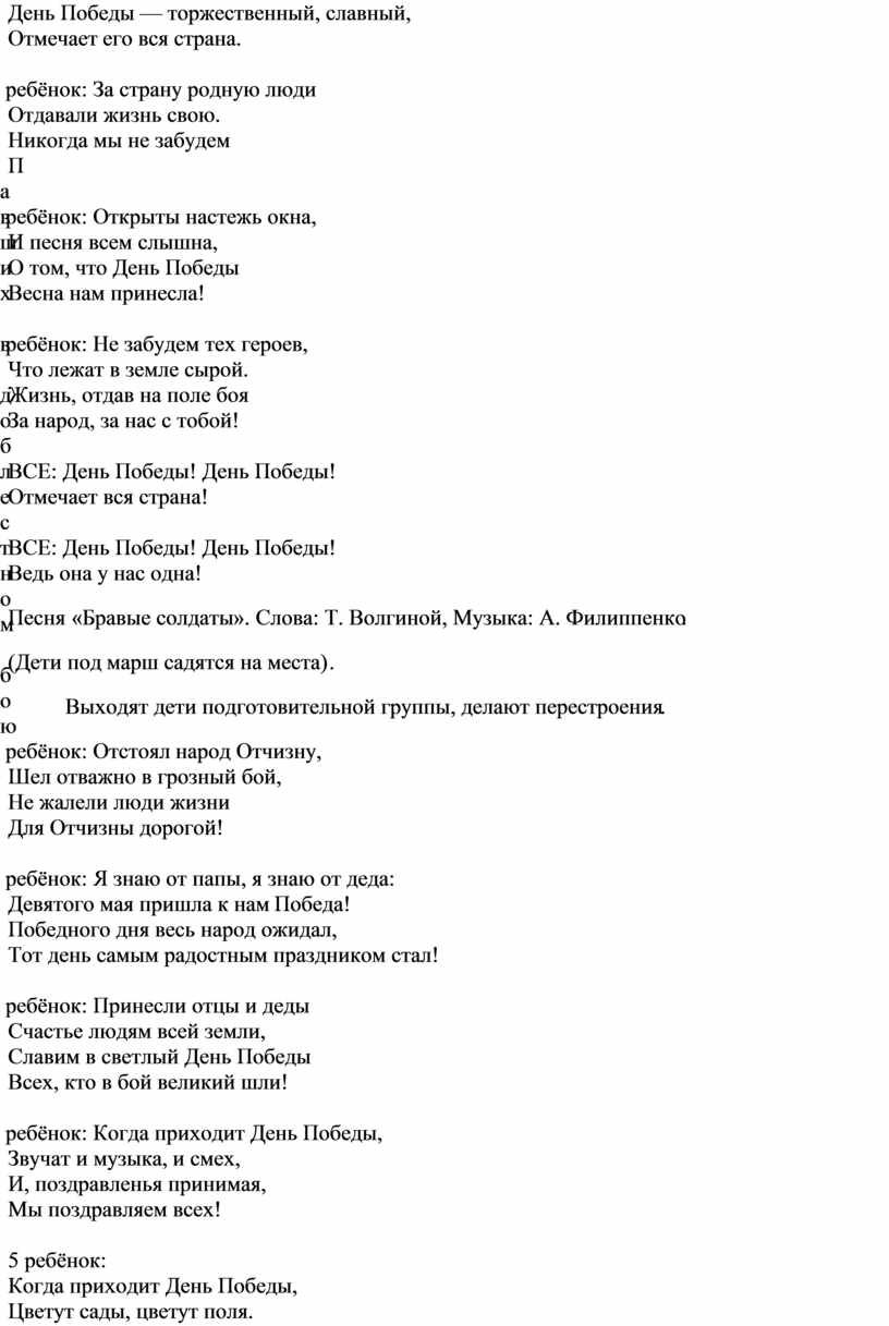 ВЕДУЩИЙ 1: Дорогие дети-гости! Скоро, 9 мая, мы будем отмечать славный праздник-День Победы. Много лет прошло с того дня, когда наш народ победил фашистскую Германию. Каждый год мы отмечаем этот замечательный праздник. И хотя вы еще маленькие, мы надеемся, что вы вырастете смелыми, сильными и порядочными гражданами, которые будут любить свою страну и встанут на ее защиту в трудную минуту.