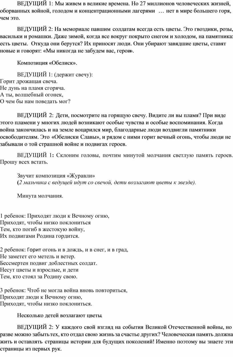 ВЕДУЩИЙ 2: Дети, посмотрите на горящую свечу. Видите ли вы пламя? При виде этого пламени у многих людей возникают особые чувства и особые воспоминания. Когда война закончилась и на земле воцарился мир, благодарные люди воздвигли памятники освободителям. Это «Обелиски Славы», и рядом с ними горит вечный огонь, чтобы люди не забывали о той страшной войне и подвигах героев.