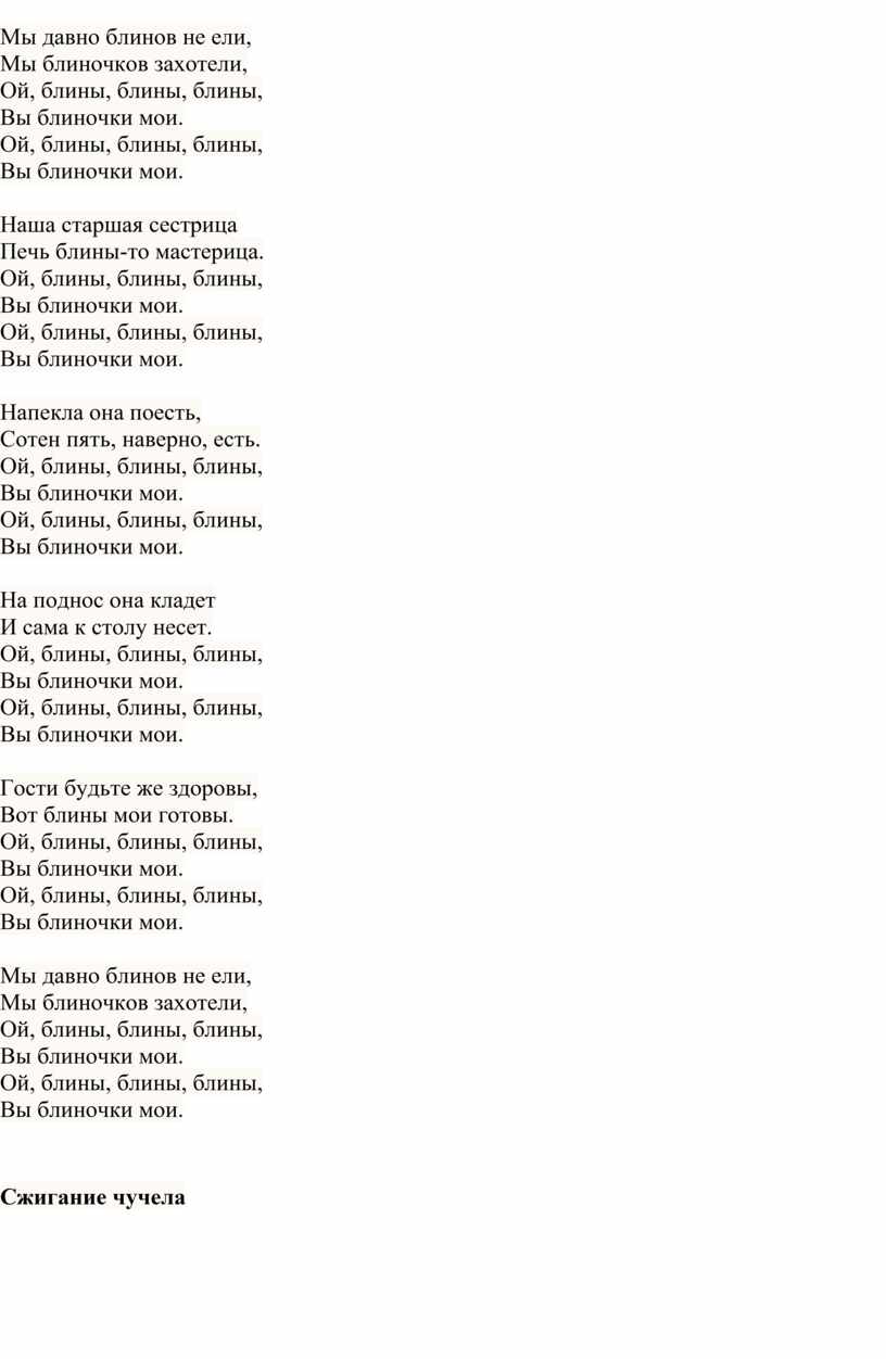 Оборудование: костюмы для детей, блины, самовары, гармонь, бубны, погремушки.
