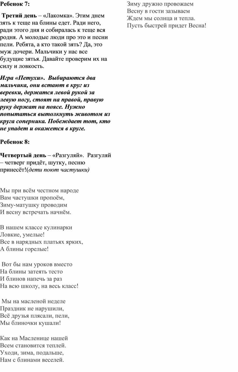 Четвертый день – «Разгуляй». Разгуляй – четверг придёт, шутку, песню принесёт!(дети поют частушки)