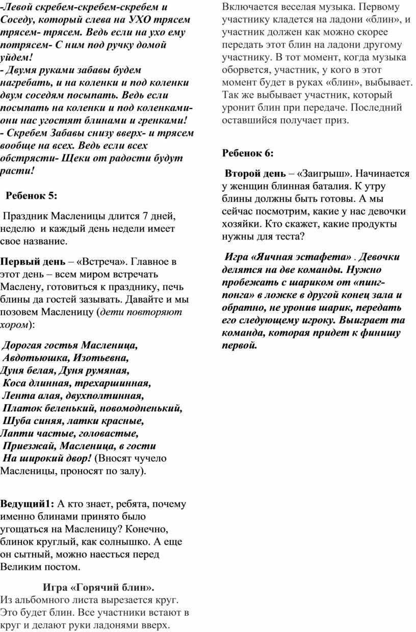 - Двумя руками забавы будем нагребать, и на коленки и под коленки двум соседям посыпать. Ведь если посыпать на коленки и под коленками- они нас угостят блинами и гренками!
