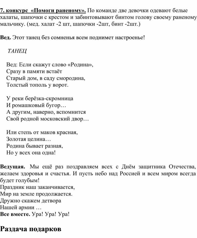 7. конкурс «Помоги раненому». По команде две девочки одевают белые халаты, шапочки с крестом и забинтовывают бинтом голову своему раненому мальчику. (мед. халат -2 шт, шапочки -2шт, бинт -2шт.)