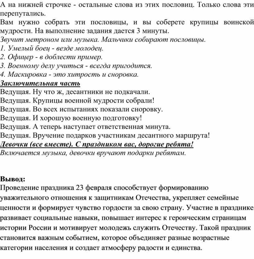 Проведение праздника 23 февраля способствует формированию уважительного отношения к защитникам Отечества, укрепляет семейные ценности и формирует чувство гордости за свою страну. Участие в празднике развивает социальные навыки, повышает интерес к героическим страницам истории России и мотивирует молодежь служить Отечеству. Такой праздник становится важным событием, которое объединяет разные возрастные категории населения и создает атмосферу радости и единства.