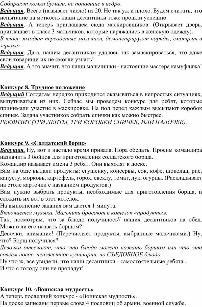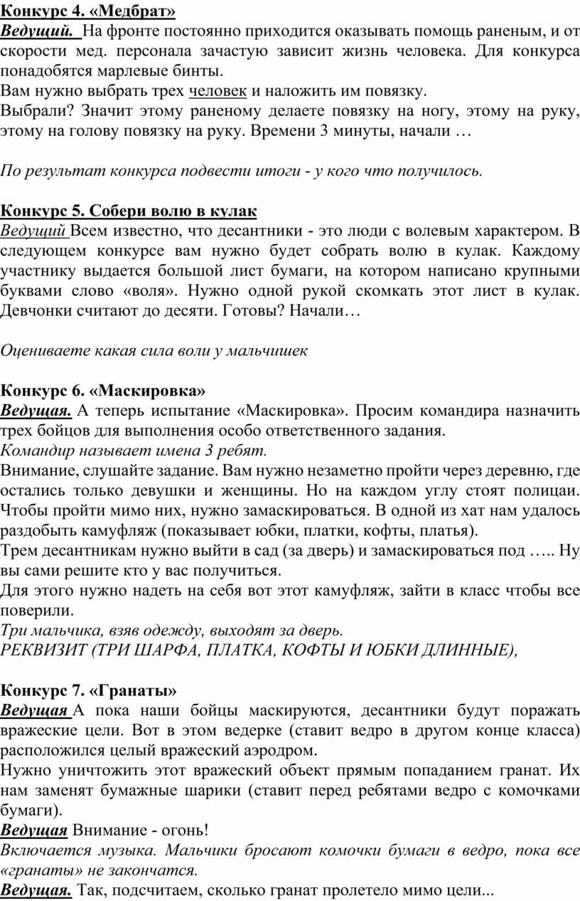 Ведущий Всем известно, что десантники - это люди с волевым характером. В следующем конкурсе вам нужно будет собрать волю в кулак. Каждому участнику выдается большой лист бумаги, на котором написано крупными буквами слово «воля». Нужно одной рукой скомкать этот лист в кулак. Девчонки считают до десяти. Готовы? Начали…
