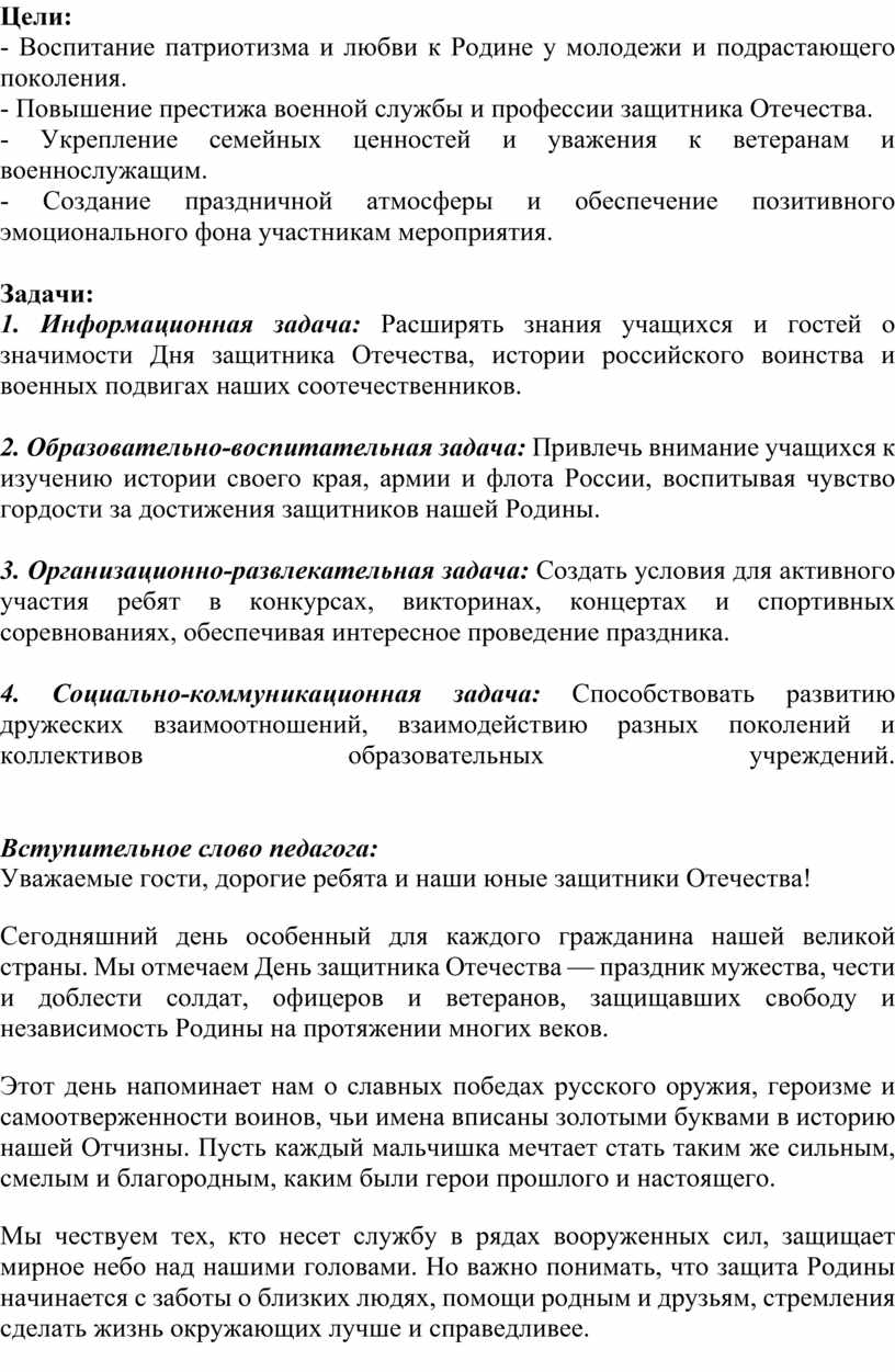 1. Информационная задача: Расширять знания учащихся и гостей о значимости Дня защитника Отечества, истории российского воинства и военных подвигах наших соотечественников.