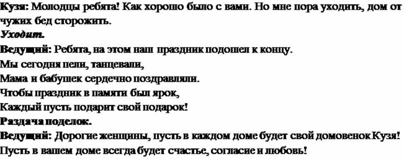 Ведущий: Дорогие женщины, пусть в каждом доме будет свой домовенок Кузя! Пусть в вашем доме всегда будет счастье, согласие и любовь!