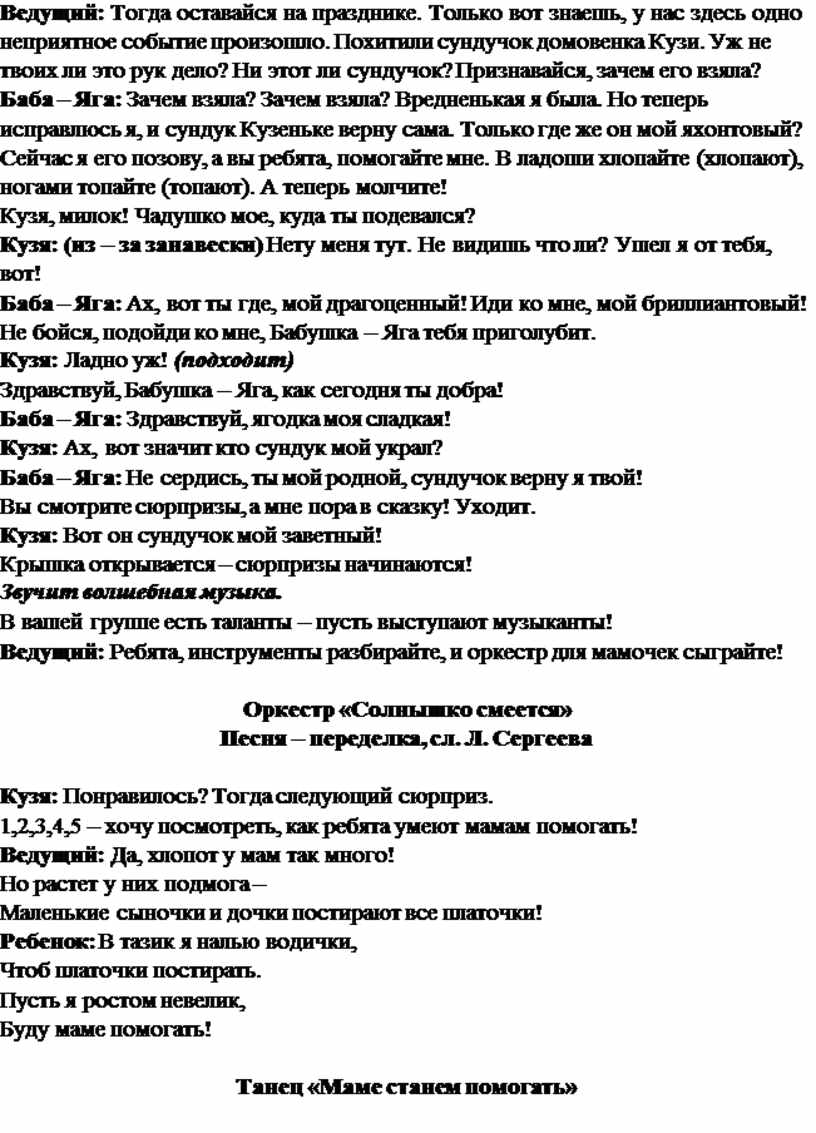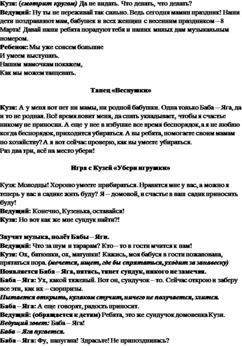 Кузя: А у меня вот нет ни мамы, ни родной бабушки. Одна только Баба – Яга, да и то не родная. Всё время ловит меня, да спать укладывает, чтобы я счастье никому не приносил. А еще у нее в избушке все время беспорядок, а я не люблю когда беспорядок, приходится убираться. А вы ребята, помогаете своим мамам по хозяйству? А я вот сейчас проверю, как вы умеете убираться.
