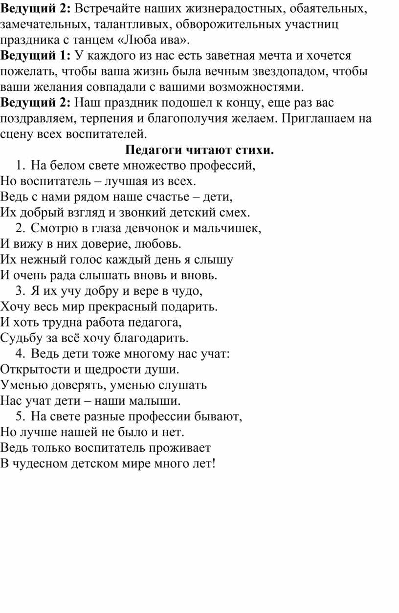 Ведущий 2: Наш праздник подошел к концу, еще раз вас поздравляем, терпения и благополучия желаем. Приглашаем на сцену всех воспитателей.