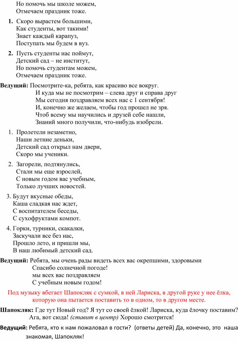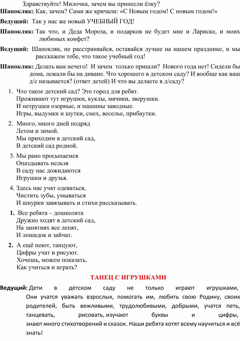 Ведущий: Шапокляк, не расстраивайся, оставайся лучше на нашем празднике, и мы расскажем тебе, что такое учебный год!