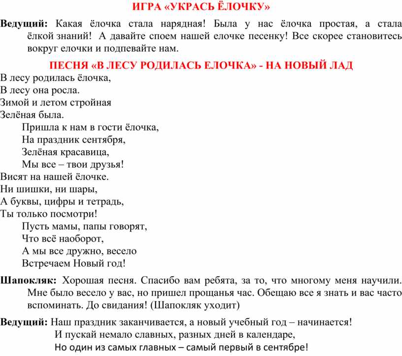 Ведущий: Какая ёлочка стала нарядная! Была у нас ёлочка простая, а стала ёлкой знаний! А давайте споем нашей елочке песенку! Все скорее становитесь вокруг елочки и подпевайте нам.