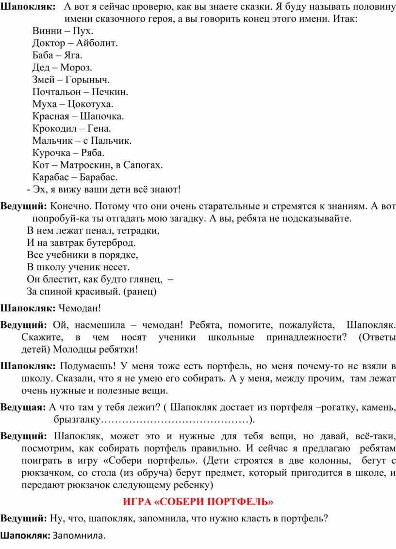Ведущий: Ну, что, шапокляк, запомнила, что нужно класть в портфель?