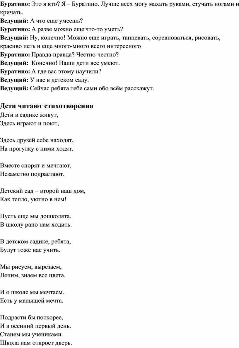 Буратино: Это я кто? Я – Буратино. Лучше всех могу махать руками, стучать ногами и кричать.