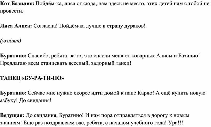 Буратино: Спасибо, ребята, за то, что спасли меня от коварных Алисы и Базилио! Предлагаю всем станцевать веселый, задорный танец!