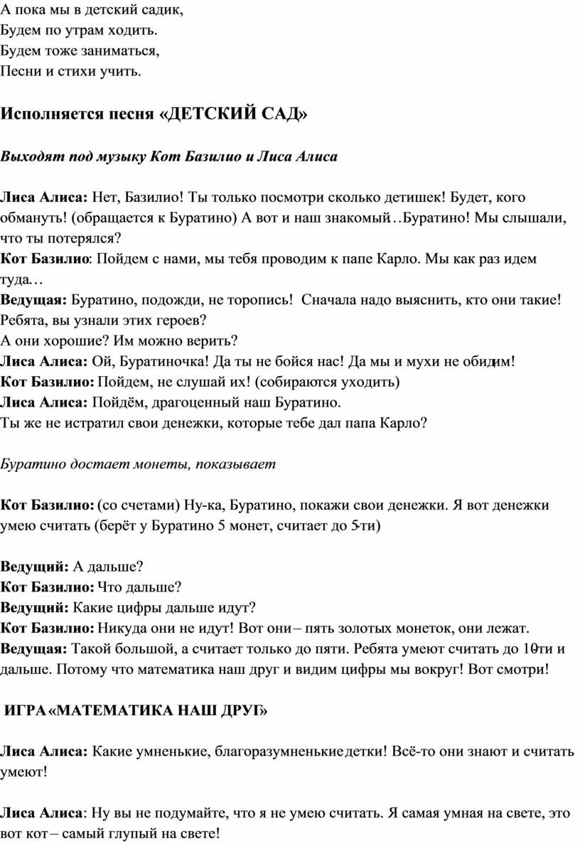 Лиса Алиса: Нет, Базилио! Ты только посмотри сколько детишек! Будет, кого обмануть! (обращается к Буратино) А вот и наш знакомый…Буратино! Мы слышали, что ты потерялся?