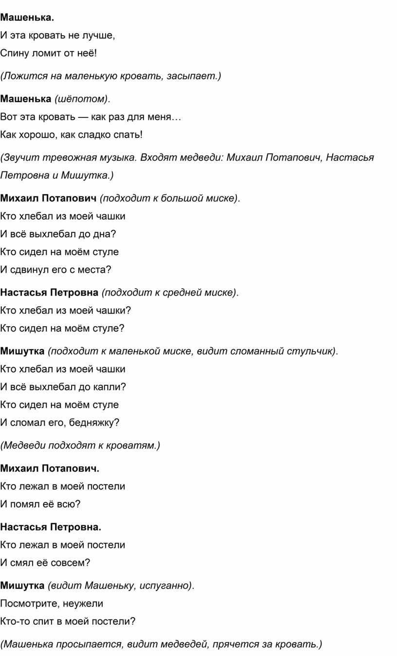 (Звучит тревожная музыка. Входят медведи: Михаил Потапович, Настасья Петровна и Мишутка.)