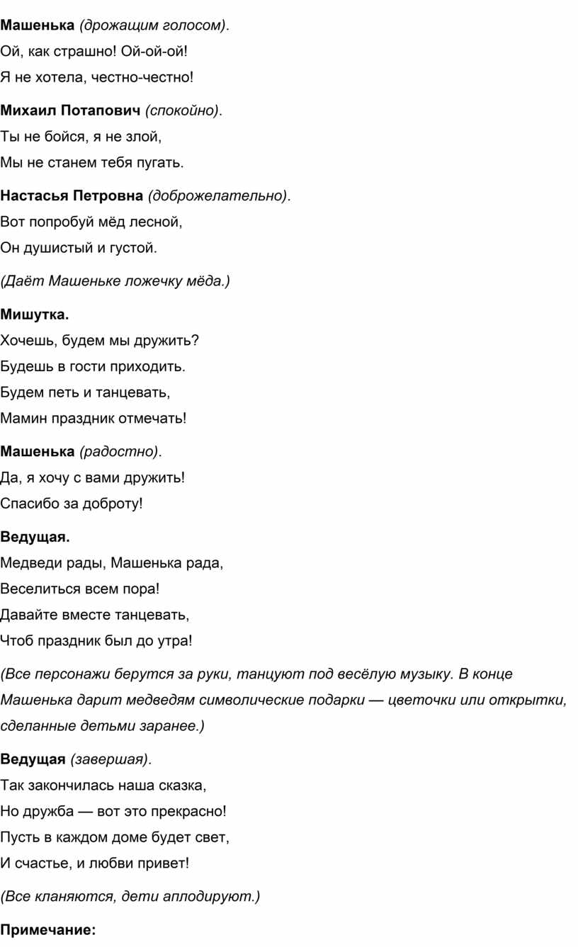 (Все персонажи берутся за руки, танцуют под весёлую музыку. В конце Машенька дарит медведям символические подарки — цветочки или открытки, сделанные детьми заранее.)