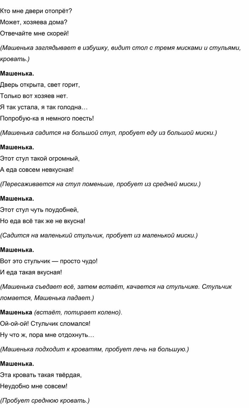 (Машенька съедает всё, затем встаёт, качается на стульчике. Стульчик ломается, Машенька падает.)