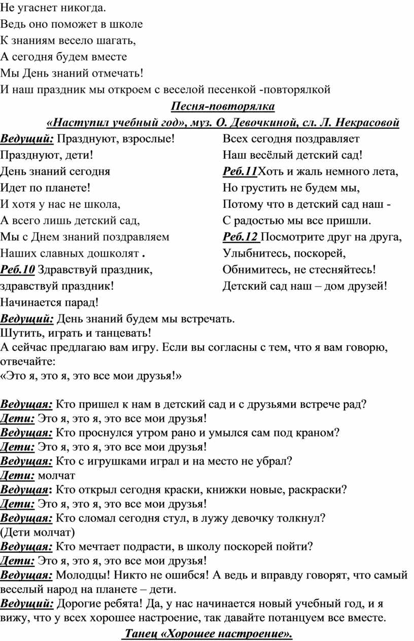 (Слайд 3) Ведущий: Правильно. 1 сентября – все девчонки и мальчишки пошли в школу. А наши детки в садик пришли. А чему же учат в детском саду?