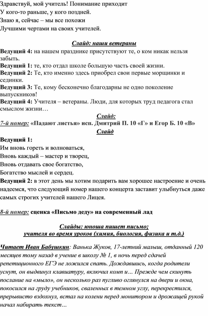 Слайды: юноша пишет письмо; учителя во время уроков (химия, биология, физика и т.д.)