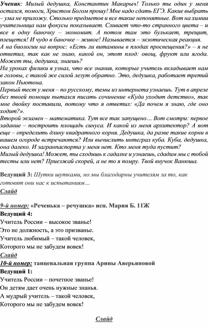 Ведущий 3: Шутки шутками, но мы благодарны учителям за то, как готовят они нас к испытаниям… Слайд