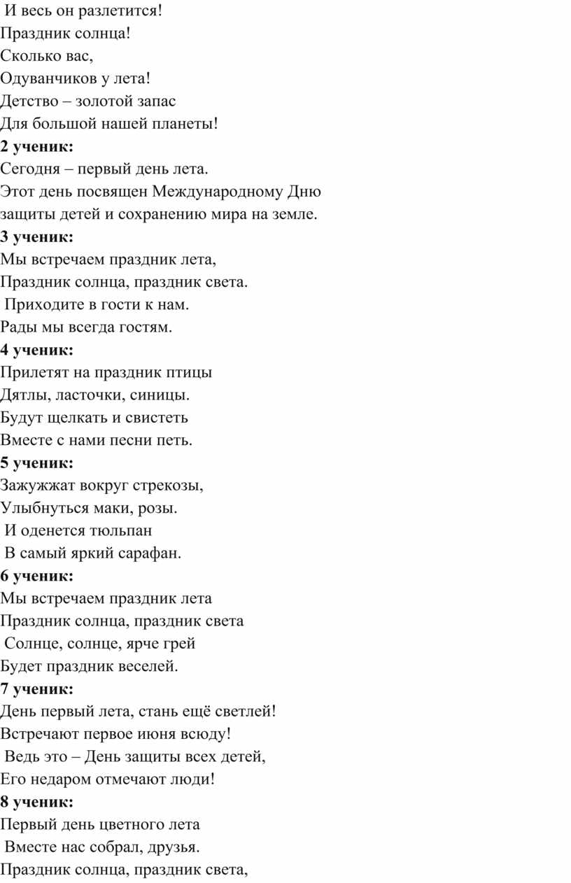 Сегодня – первый день лета. Этот день посвящен Вам, дорогие ребята. Каждый день этого радостного большого праздника будет распахиваться, как новая страница интересной и яркой, красочной книги. Это книга, в которой будут и песни, и картины, и игры, и сказки, и загадки, и походы, и приключения! Каждый день летнего календаря красный, потому что каждый день лета – это радость, отдых, праздник! А самое главное – это мирное небо над нами!