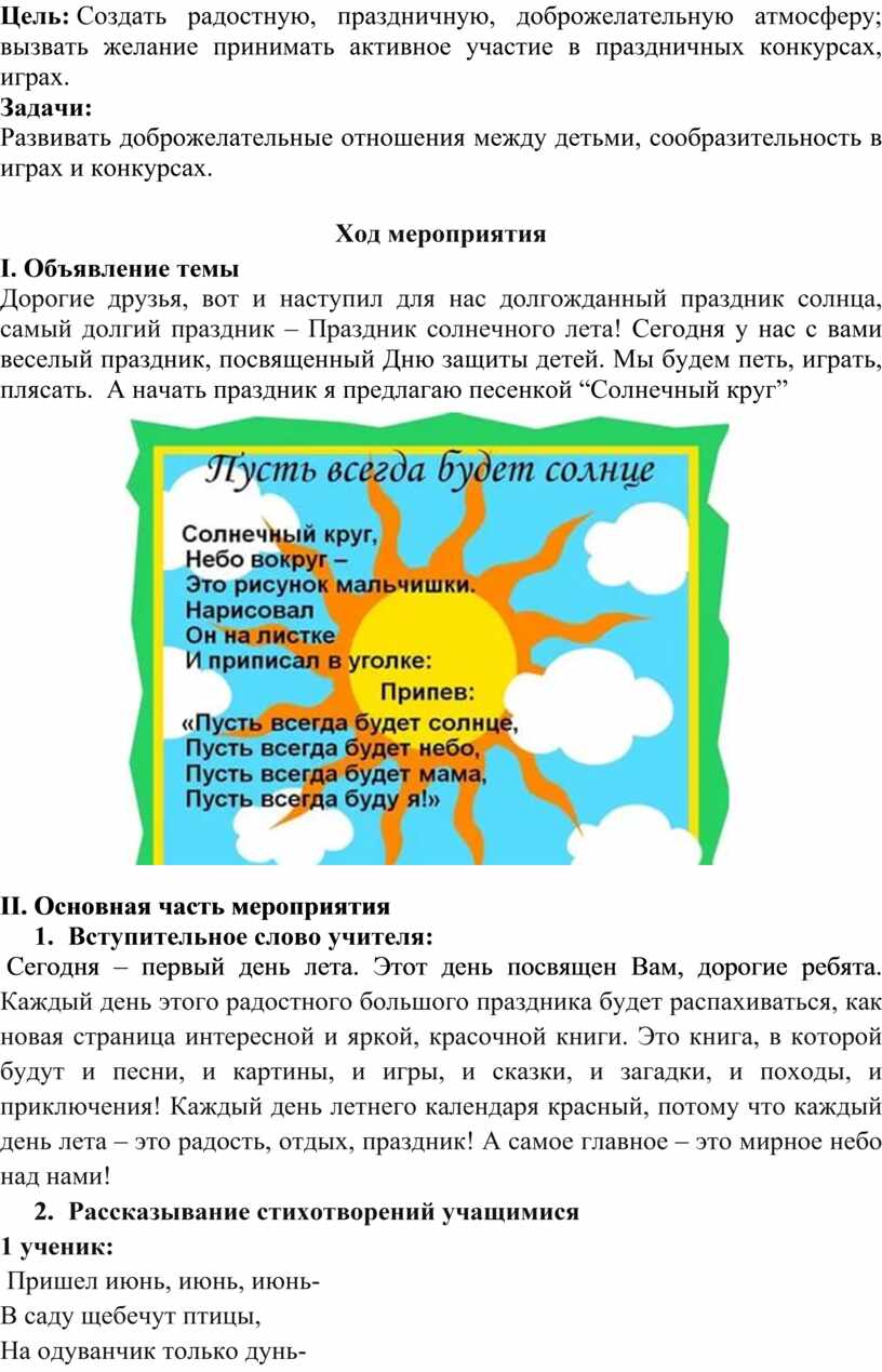 Дорогие друзья, вот и наступил для нас долгожданный праздник солнца, самый долгий праздник – Праздник солнечного лета! Сегодня у нас с вами веселый праздник, посвященный Дню защиты детей. Мы будем петь, играть, плясать. А начать праздник я предлагаю песенкой “Солнечный круг”