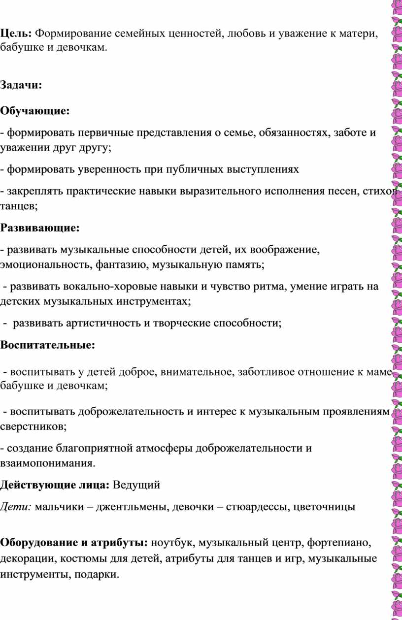 - воспитывать у детей доброе, внимательное, заботливое отношение к маме, бабушке и девочкам;