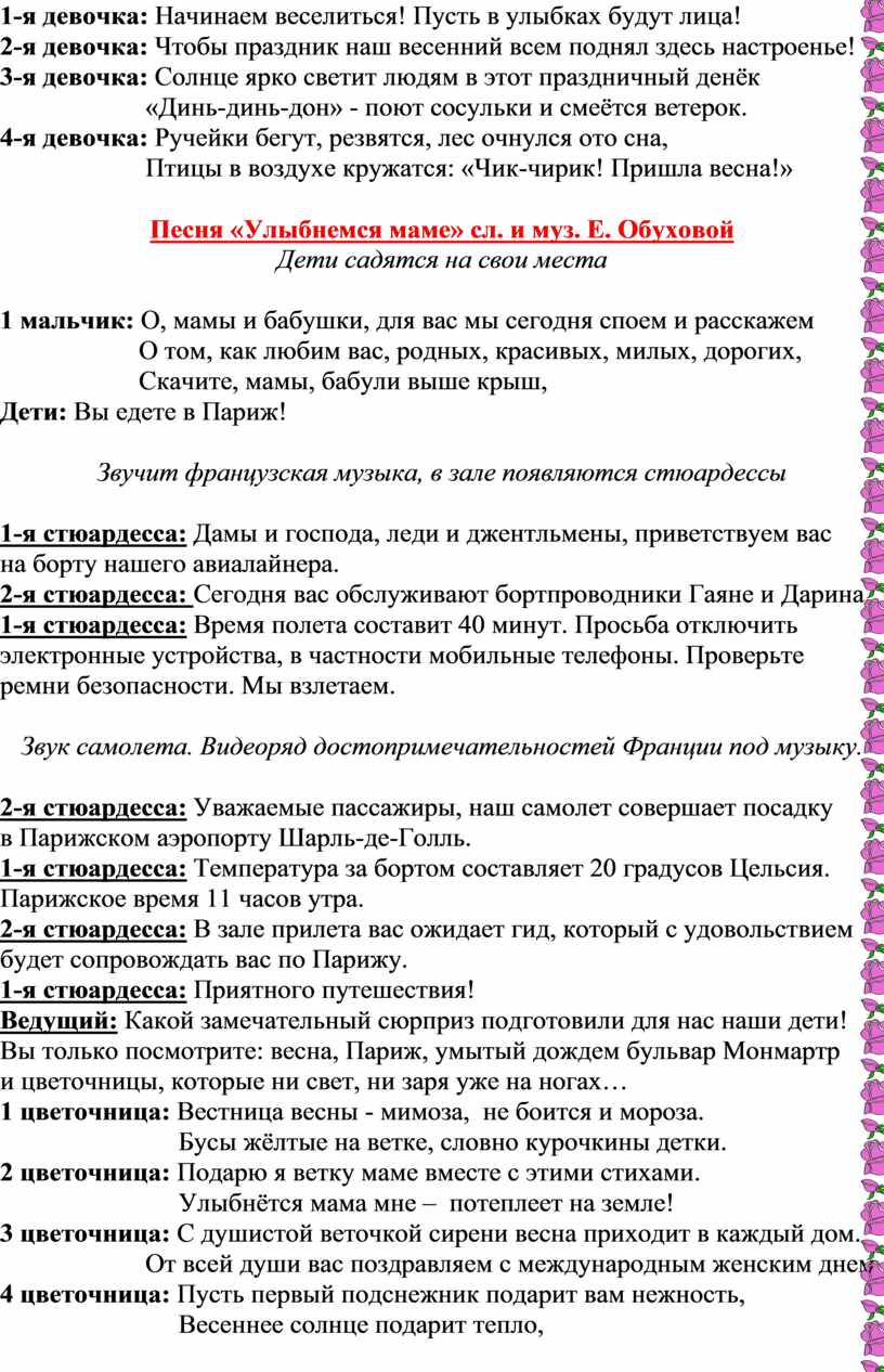 Ведущий: Вот и заканчивается наша прогулка по Парижу. Нам пора возвращаться на борт самолёта.