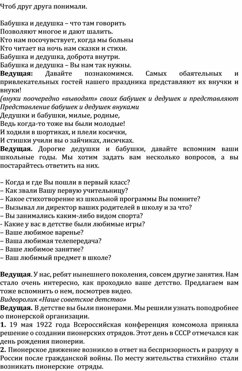 Ведущая. Дорогие дедушки и бабушки, давайте вспомним ваши школьные годы. Мы хотим задать вам несколько вопросов, а вы постарайтесь ответить на них.
