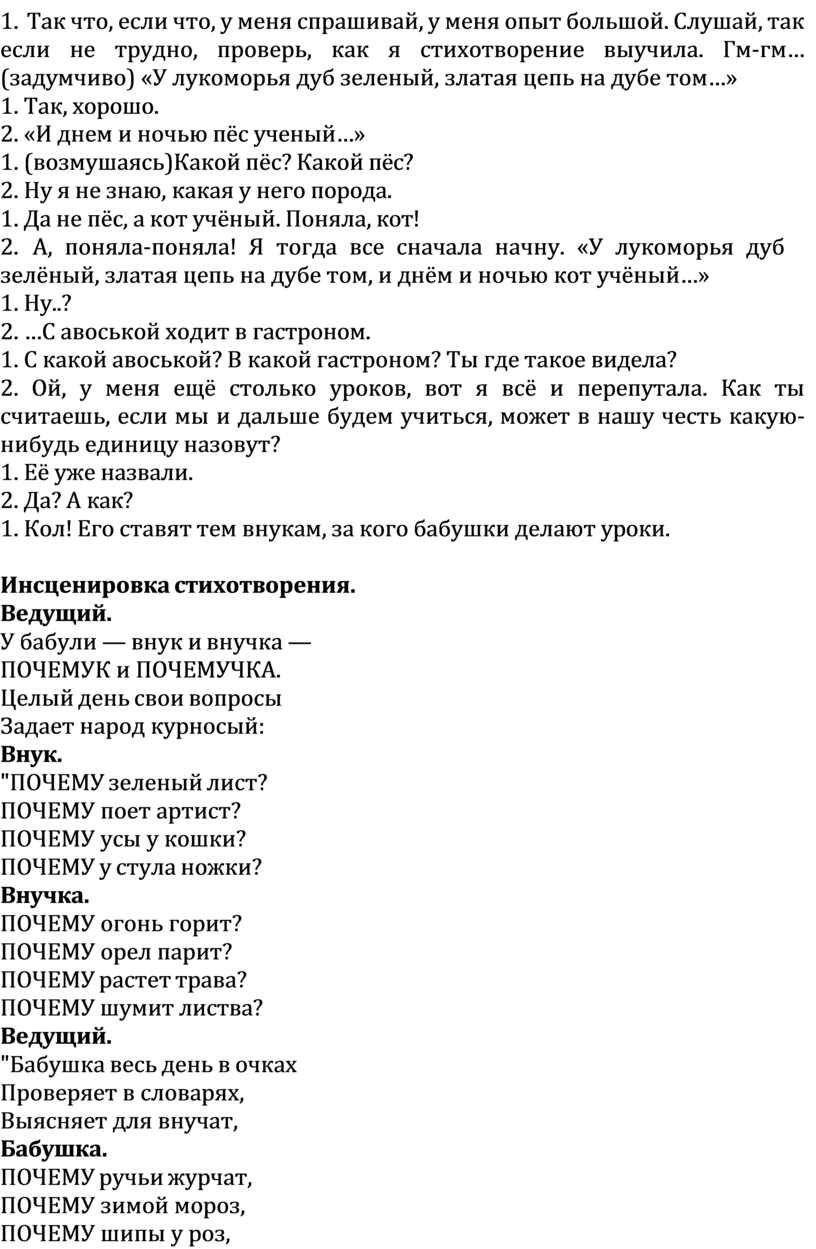 2. Так что, если что, у меня спрашивай, у меня опыт большой. Слушай, так если не трудно, проверь, как я стихотворение выучила. Гм-гм… (задумчиво) «У лукоморья дуб зеленый, златая цепь на дубе том…»